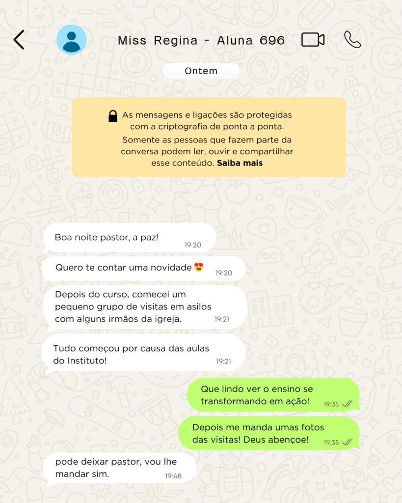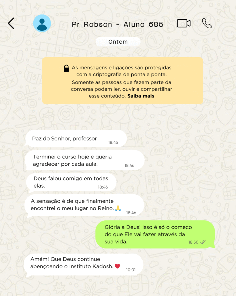 O curso de capelania do Instituto Kadosh superou minhas expectativas. O conteúdo é claro, prático e realmente transforma o ministério. Vale muito a pena comprar esse curso, porque o investimento retorna em crescimento espiritual e preparo para servir melhor.