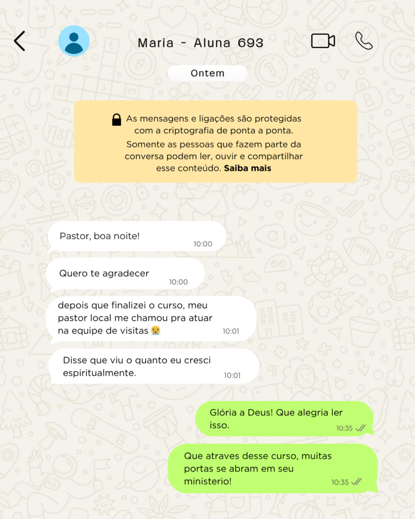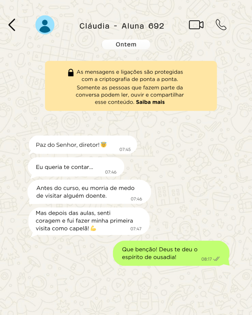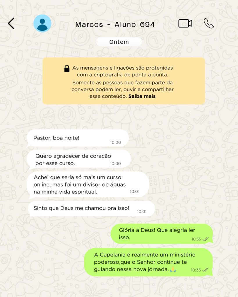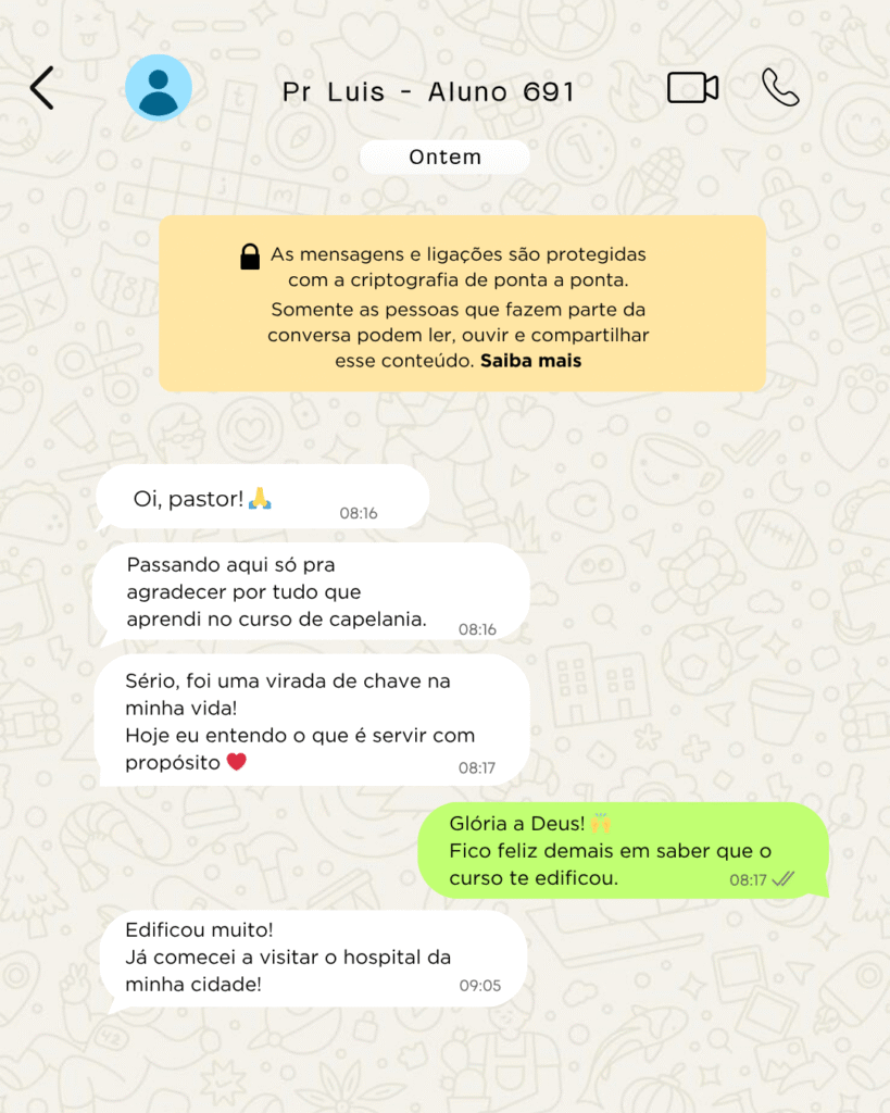 Eu sempre tive o desejo de servir a Deus além das quatro paredes da igreja, mas não sabia como começar. Quando encontrei o curso de Capelania, vi uma oportunidade incrível. As aulas são claras, objetivas e totalmente baseadas na Palavra. Hoje eu atuo como capelão na minha comunidade, levando apoio espiritual a pessoas que realmente precisam. Só gratidão por tudo que aprendi aqui!